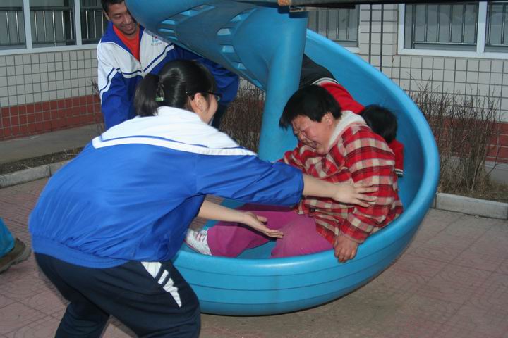 与孤儿院的孩子一起玩滑梯