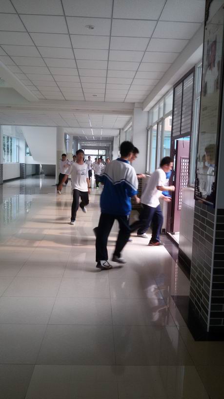 在演练前,班主任对各班学生进行了安全动员,并且布置了逃生路线,共同学习了逃生法则,做好了各项准备工作。6月5日下午班会课期间,演练活动准时开始。随着刺耳的哨音响起,各班班主任迅速组织学生列队抱头按顺序随着事先拟定的下楼顺序离开教学楼,各相关人员在楼梯口、教学楼出口和操场入口等负责协助撤离。由于安全预演策划有序,所有师生不到一分钟就已经安全撤离到操场上,井然有序,未出现任何挤压、践踏情况。