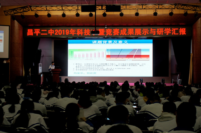 2019年11月4日下午, 以发现、创新、责任为主题的昌平二中2019年科技节正式拉开帷幕。北京市青少年科技中心主任张晓虎,昌平区政协副主席、区科协主席李雪红,昌平区科协党组书记李成旺,昌平区教育工会主席王长军,清华大学博士李寅,昌平二中教育集团总校长王志强及学校相关领导、科技教师、高一年级师生参加了开幕式。开幕式上,入围2019明天小小科学家活动全国终评的朱简同学,荣获第39届青少年科技创新大赛北京市一等奖的史涵君同学,荣获北京市后备人才展评活动中最佳学生奖的付杰、朱定萌、李新颖同学等分别和大家分享获奖成果。他们的展示受到与会领导的高度评价,带给参会同学们很大启发!
