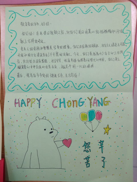活动伴随着郑文华主任深情演唱的《最美夕阳红》拉开序幕,新疆学生在婉转的歌声中将一张张亲手制作满载祝福的“重阳节”祝福卡和色泽鲜艳、象征着乐观阳光、欣欣向荣的太阳花风送到老教师手中,祝愿老教师幸福康健。