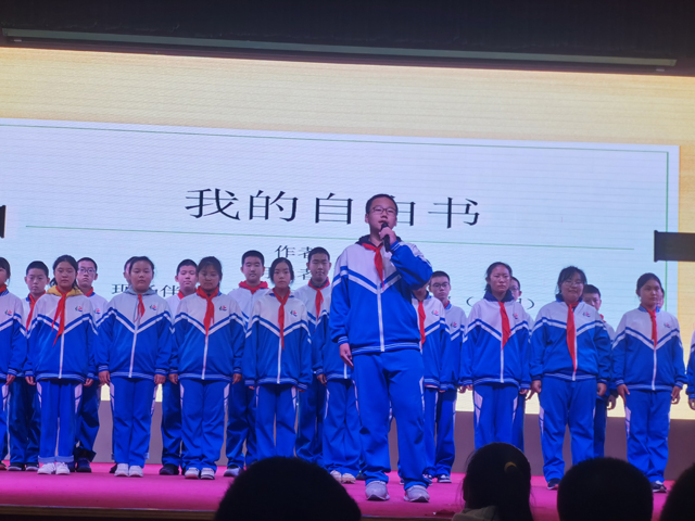 是您,用长江黄河的乳汁哺育了我;是您,用华夏千年的文明教育了我;是您,给了我一双寻梦的翅膀;是您,铸就了我钢铁般坚硬的脊梁。接下来,初一(10)班全体学生声情并茂地献上了诗朗诵《我的祖国》。