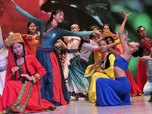 在学校的精心筹备下,新疆部王继峰主任、石雪飞副主任以及舞蹈团周麟老师,带领一支融合了新疆学生和本地学生的舞蹈团队进行展演。他们带来的"石榴籽一家亲"舞蹈,不仅彰显了学生们卓越的舞蹈技艺,更传递了各民族学生间深厚的友谊和紧密相连的团结精神。舞台上,各族学生相互交织,共同绘就了一幅和谐共融的绚丽画卷,赢得了现场观众的热烈掌声。