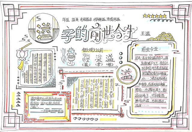 寻根问祖,一语一字都是故事。初一年级全体同学追根溯源,了解自己名字中某个字在不同朝代的写法,并绘制汉字演变手抄报。这些色彩明丽、意蕴丰富的手工作品,记录着同学们对名字的了解与热爱,展示了孩子们无限的创造力。