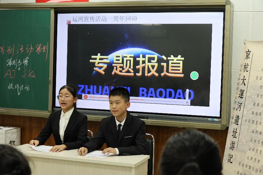 汇报环节形式新颖,来自初二14班赵师齐同学与初二18班林昭玥同学用专题播报形式将一年活动展现在大家面前,而新闻视频则由初二17班严子涵同学制作完成;