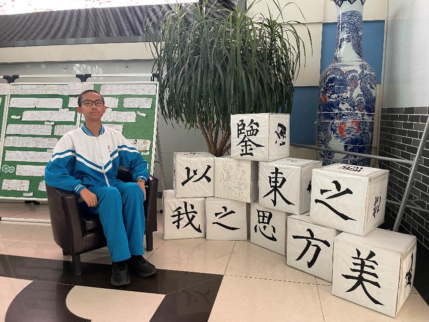 最后校内策划展览环节采用微短剧形式,三幕短剧将活动设计与实施等环节展现在舞台上,微短剧的演员是初二24班五位同学和一名初二16班同学组成,他们既是“以我之思鉴东方之美”展览的策划人也是微短剧的编剧、导演以及演员。李亦童做导演、周瓒做海报、范茗月书写宣传词、田婧琪积极布展,张曦文打磨展览细节……