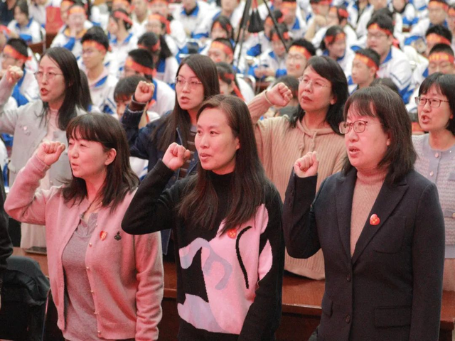 最后的宣誓环节将大会推向高潮!教师方阵率先宣誓,他们承诺将恪尽职守,精诚团结,科学备考,为学子们保驾护航,做他们最坚强的后盾!