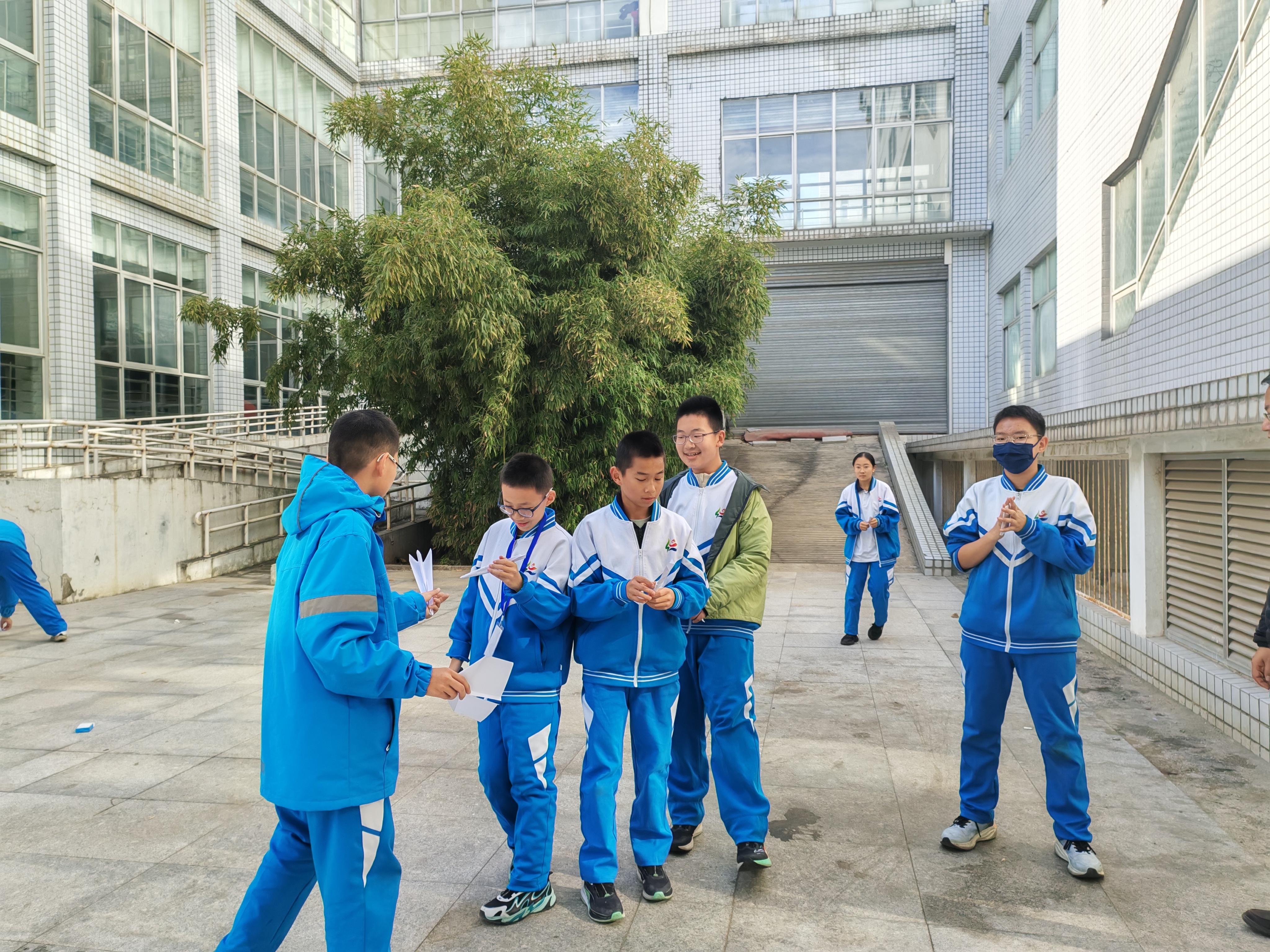 制作完成后,一场别开生面的“试飞大会”在欢声笑语中展开。同学们三五成群,有的两两比赛,看谁的飞镖飞得更远、更稳;有的独自揣摩,反复调试改进;还有的则化身“工程师”,返回教室对飞镖进行“升级改造”。小小的纸飞镖,承载着同学们的巧思与欢乐,在天空中划出一道道探索的轨迹。