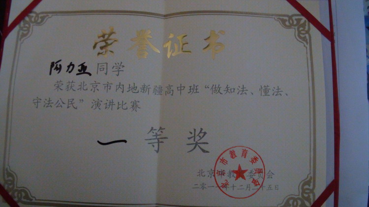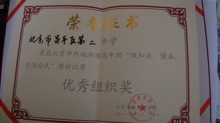 2011年12月25日,在北京市内高班学生“做知法、守法、懂法公民”的演讲比赛中,代表我校内高班参加比赛的高二(6)班学生阿力亚获得一等奖,高二(1)班学生艾比班获得三等奖,他们的指导老师分别是唐棠老师和李鹏老师。获得一等奖的阿力亚同学将代表北京市参加全国的决赛。同时,昌平二中在本次演讲比赛中获得优秀组织奖。