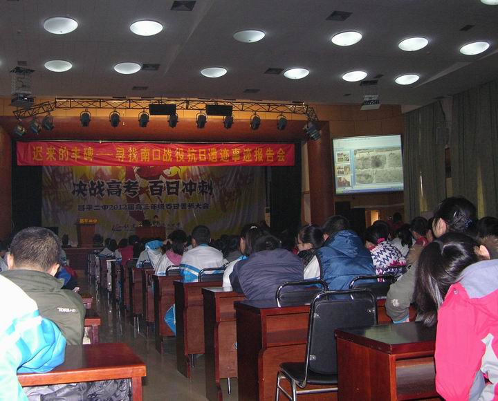 2012年3月16日,昌平二中组织召开了以“迟来的丰碑——寻找南口战役抗日遗迹”为主题的报告会。报告会由抗战史专家杨国庆老师主讲,他研究南口战役已有6年之久,踏访当年的战地,寻找70年前的战争遗迹、遗物,并走遍大江南北寻访战争亲历者。初一、初二年级全体师生共400余人参加。