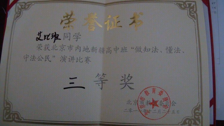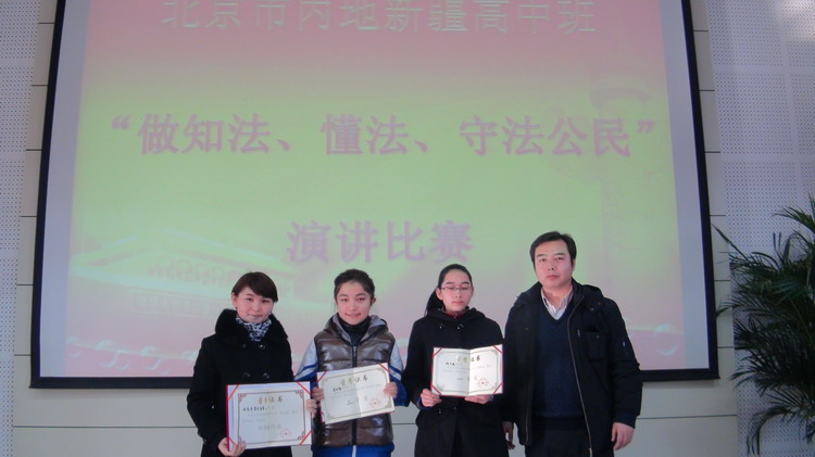 2011年12月25日,在北京市内高班学生“做知法、守法、懂法公民”的演讲比赛中,代表我校内高班参加比赛的高二(6)班学生阿力亚获得一等奖,高二(1)班学生艾比班获得三等奖,他们的指导老师分别是唐棠老师和李鹏老师。获得一等奖的阿力亚同学将代表北京市参加全国的决赛。同时,昌平二中在本次演讲比赛中获得优秀组织奖。
