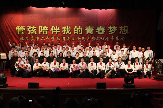 12月30 日晚,昌平二中管乐团在报告厅举行了“管弦陪伴我的青春梦想”昌平二中管乐团建团十周年暨2013新年音乐会。中国人民解放军军乐团办公室主任、中国管乐协会秘书长王启民、中国人民解放军军乐团国家一级作曲家王和声,以及昌平区音乐家协会主席驰骋等、昌平区教委体美科刘坤等领导和专家观看了演出。