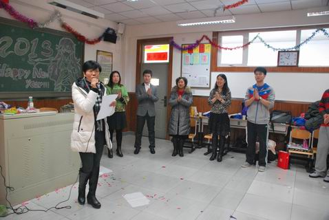 20121231日上午,按学校统一安排,昌平二中回龙观校区各班师生在教室中开展迎新年联欢活动。各个班级精心布置了教室、准备了丰富多彩的联欢会节目及活动,气氛热烈而温馨,各班还在班级门口统一贴出由班级学生自己书写的对联,衬托出浓浓的节日气氛。褚春梅副校长、金秀荣副校长、赵文进主任及谭兴主任分三组带领领导班子成员分别到各班为师生送去节日祝福。