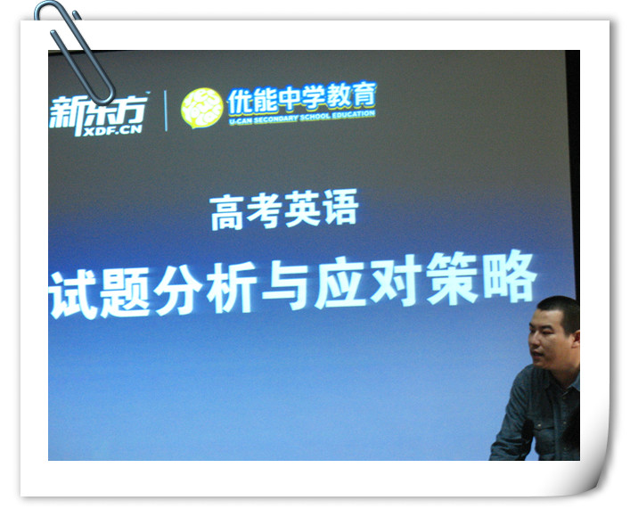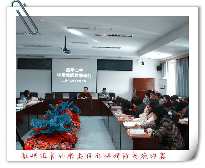 2013年12月3日下午,新东方北京地区高中部负责人(优能中学教育)陶然老师来到昌平二中,与二中英语教师交流,共同探讨高考英语试题分析与应对策略,并对北京英语高考各题型进行规律性总结。北京新东方学校还把近期复习资源,即真题模拟题考点精讲资料汇编与老师们分享。