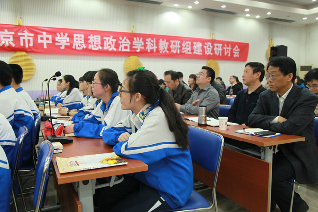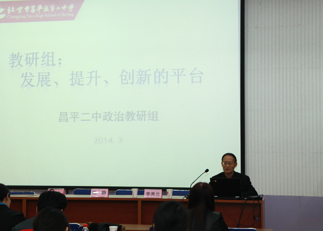 2014年3月27日,“北京市中学思想政治学科教研组建设研讨会”在昌平二中召开。王伟、李靖、李建三位老师分别做了课题为《文化与经济、政治》、《思想道德修养与科学文化修养》、《高三复习课:明天谁来当“农民” 》的研究课。政治学科组组长,特级教师刘焕林老师做了题为《教研组:发展、提升、创新的平台》的主题汇报,从制度建设、理论提升、课题研究、教材编写、名师引领、他山之石、教学研摩、社会调查、和睦相处等九个方面汇报了昌平二中政治组建设情况。专家点评认为几节研究课展现了政治教师的独特风范——关心时事、明理思辨,使学生感受到了身边处处皆“政治”,弘扬了社会主义核心价值观,实践了立德树人的教育理念,具有说服力的、生动鲜活的教育价值;认为政治学科教研组建设活动开展的扎实有效,学习、研究气氛浓厚,教学、科研成果丰硕,尤其是教研组内精诚团结,有家的氛围。同时,与会领导对学校及全市今后工作提出希望。会议由北京市基教研中心德育教研室主任王礼新主持,北京市基教研中心副主任李卫东、昌平区教委高中科科长孙立、昌平教师进修学校副校长陈静、昌平二中校长王志强以及各区县的专家、教研员、教师140余人参加会议
