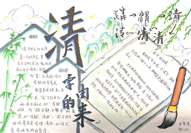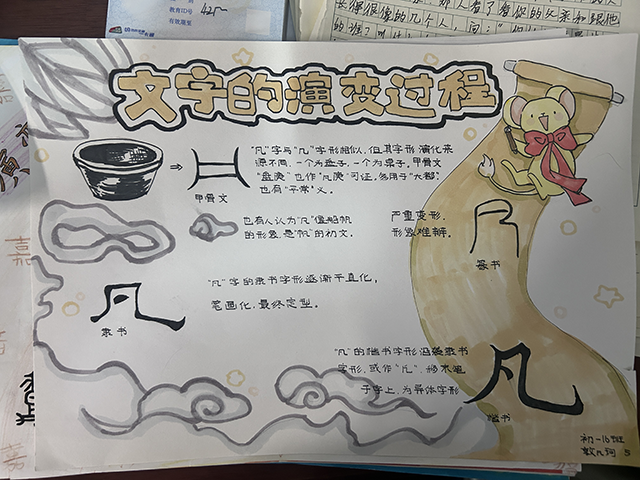 寻根问祖,一语一字都是故事。初一年级全体同学追根溯源,了解自己名字中某个字在不同朝代的写法,并绘制汉字演变手抄报。这些色彩明丽、意蕴丰富的手工作品,记录着同学们对名字的了解与热爱,展示了孩子们无限的创造力。