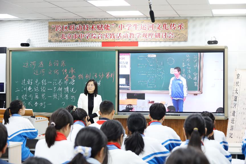 在教学观摩环节,昌平二中回龙观校区初二年级历史教师兼综合实践教师杨海燕老师带领“国风知行”跨学科学生工作室的学生们一起回顾从2023年11月至2024年11月为期一年围绕中华优秀传统文化尤其是京杭大运河开展的系列活动。