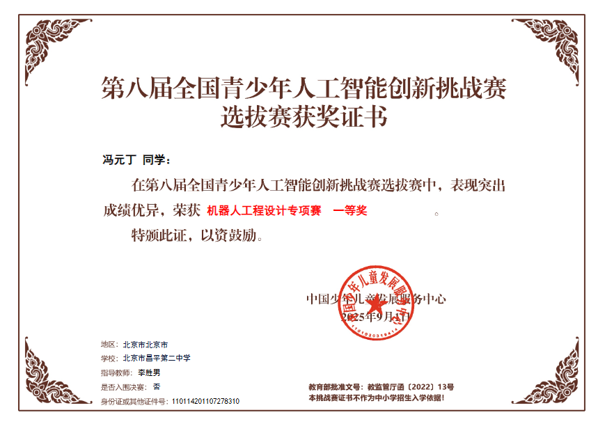 面对强劲对手,昌平二中初三 4 班冯元丁同学沉着应对、从容发挥,在机器人工程设计专项赛中,凭借新颖、严谨的工程逻辑与娴熟的操作技能一路突围,最终斩获一等奖,为学校赢得荣誉,也为自己的暑期科创实践交出完美答卷。