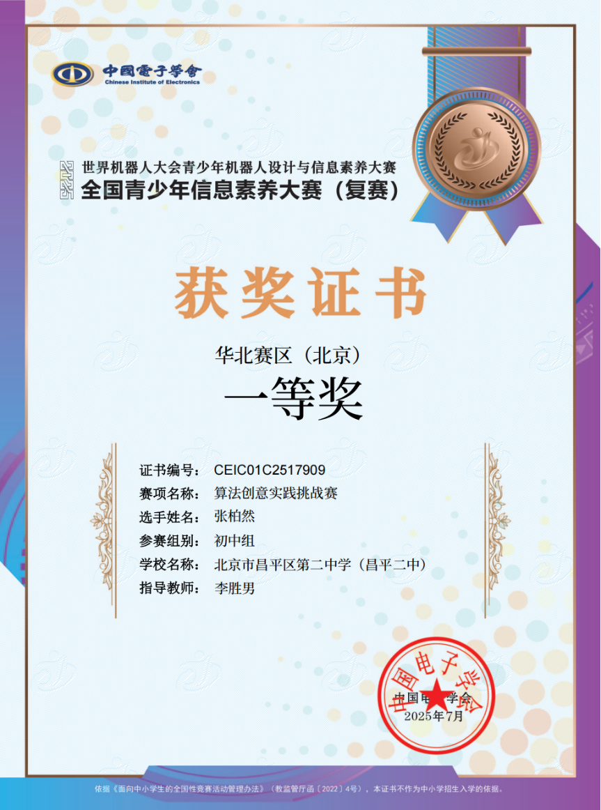 近年来,昌平二中始终将科技创新教育作为培养新时代人才的重要抓手,持续推进中小学信息科技课程与人工智能课程建设,不断完善科技创新教育实践平台,常态化开展科技社团活动、学科竞赛培训、科创成果展示等系列活动,为学生搭建起提升信息素养、展现创新才华的广阔舞台。此次暑期双赛获奖,既是学子们刻苦钻研、勇于实践的成果,更是学校长期深耕科创教育、践行“以科技赋能成长”育人理念的生动见证。