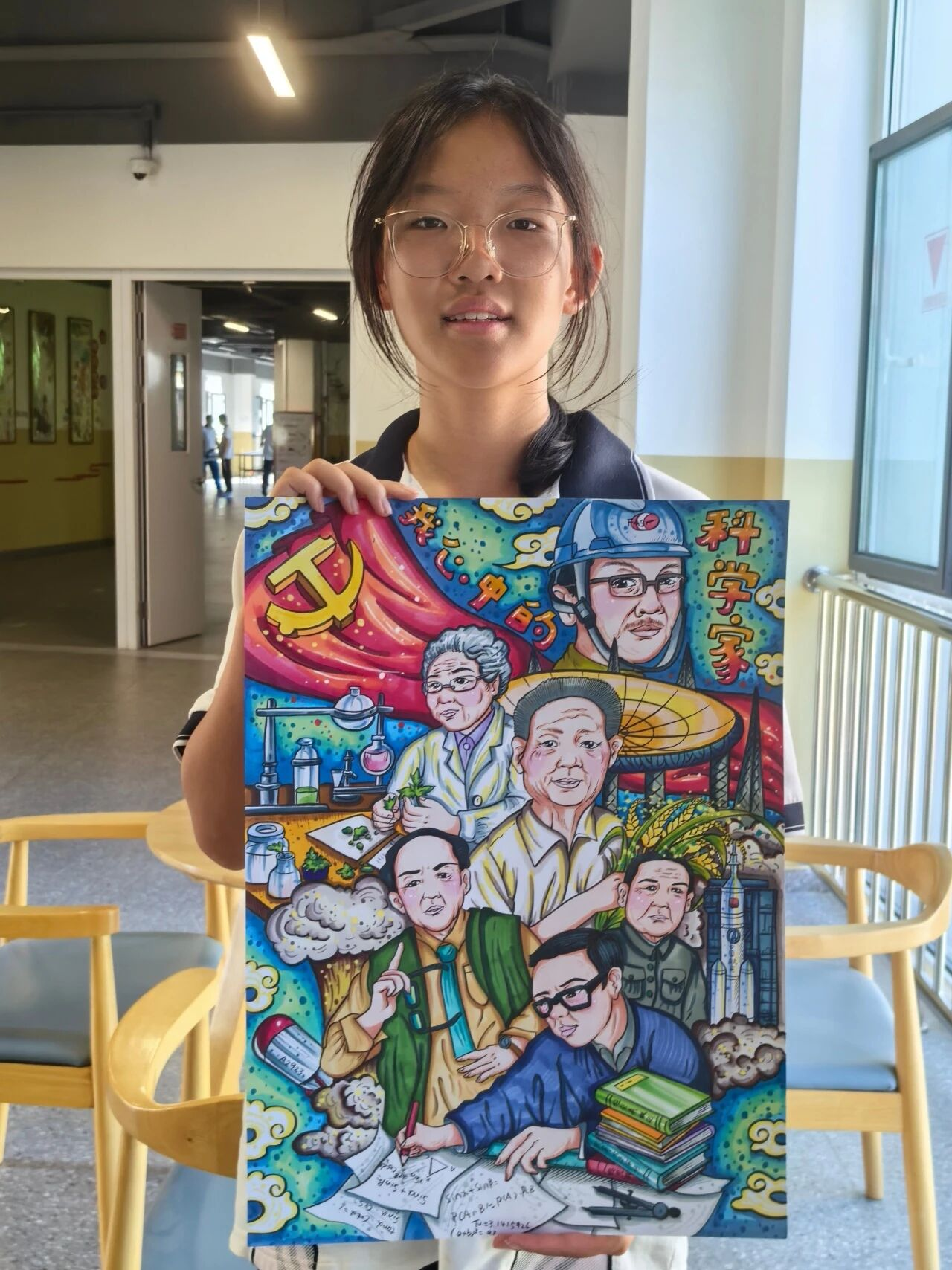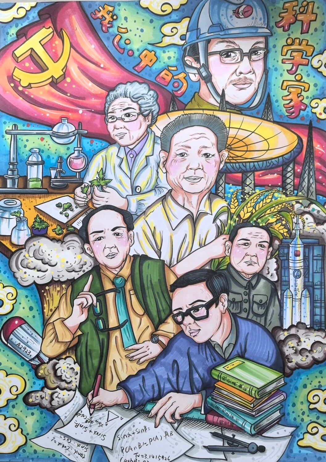 育知校区八(1)班 王依诺:这幅画展现了多位中国科学家形象。画面有党旗,还搭配了实验室设备、卫星火箭、稻穗等元素,体现科学家们在不同科研领域的贡献,彰显了他们为国家科研事业拼搏奋斗的精神。