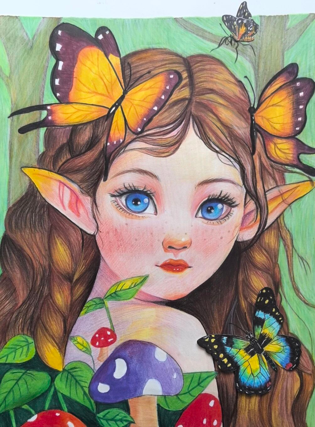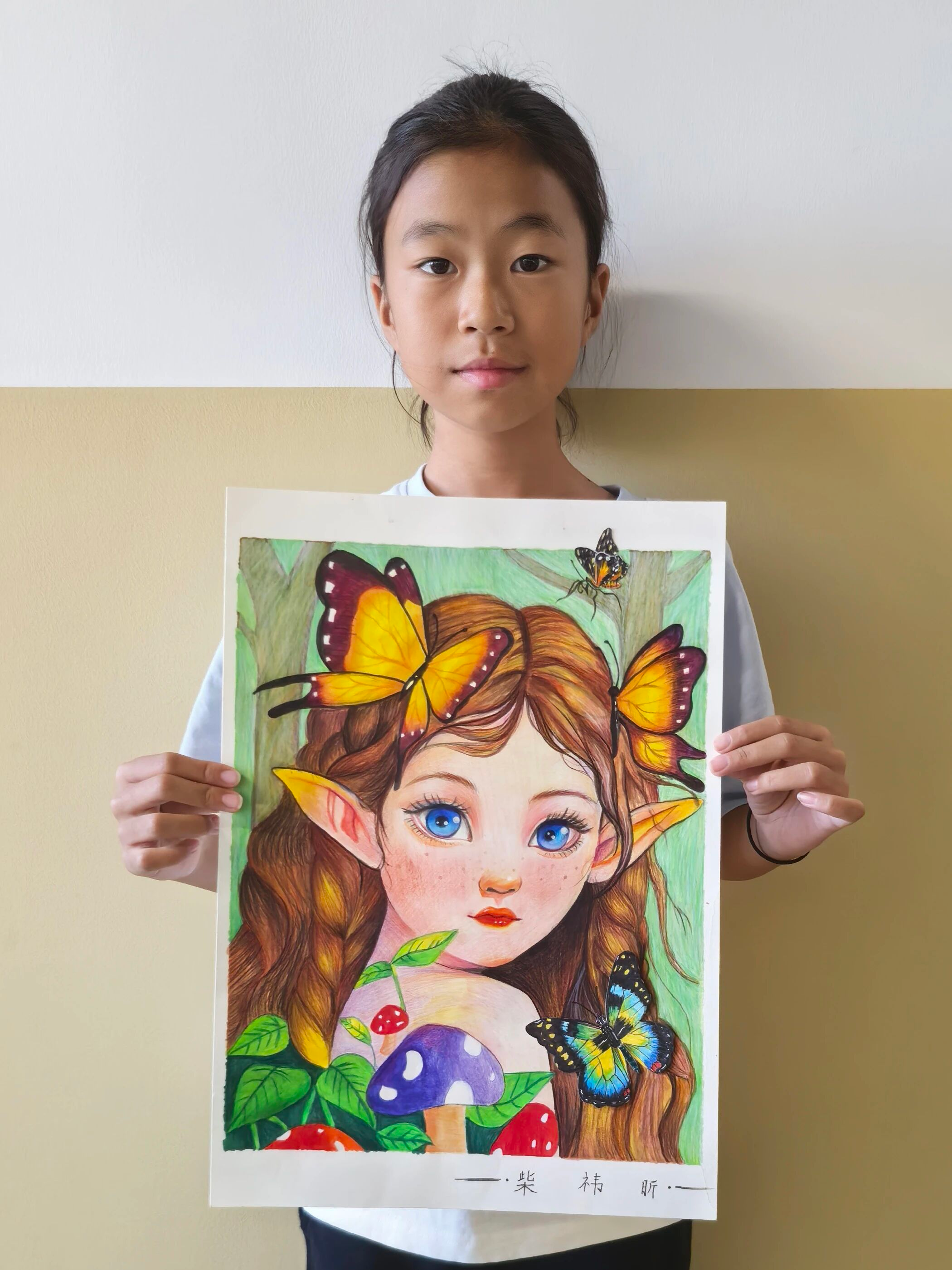 育知校区五(2)班 柴祎昕:这幅画塑造了森林精灵的形象,精灵有着灵动的尖耳朵,发丝间停驻色彩斑斓的蝴蝶。周围环绕着蘑菇、绿叶等植物,背景是绿意盎然的森林,整体画面充满奇幻色彩,仿佛将观者带入了一个神秘又美好的童话森林世界。