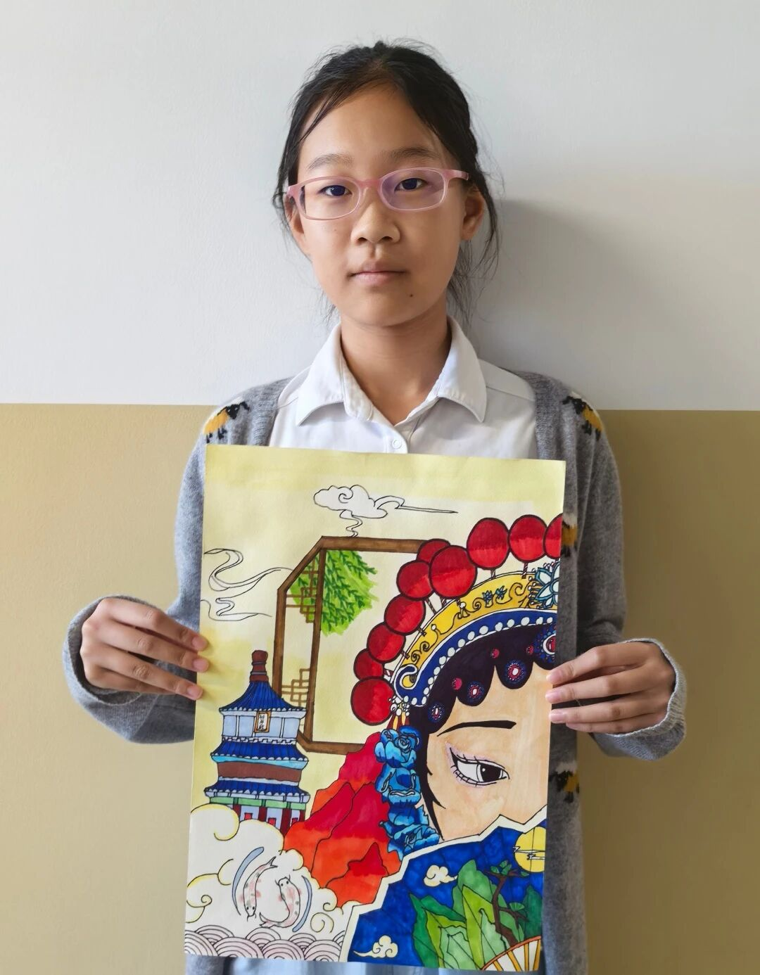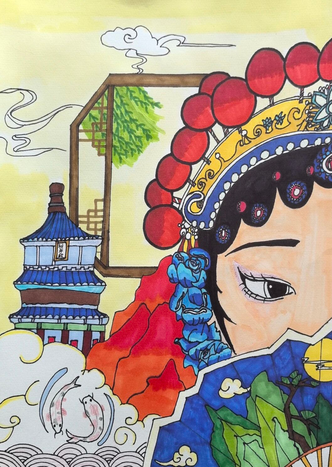 育知校区六(2)班杨华钰:这幅画融合了京剧与传统元素。画中人物佩戴京剧头饰,展现出京剧扮相的特点。背景里有古建筑楼阁、柳树、祥云、游鱼等元素,洋溢着浓郁的中国传统文化氛围 。