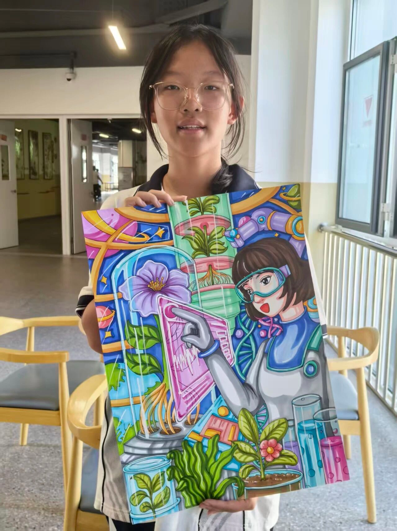育知校区八(1)班 王依诺:这幅画展现了未来科技与植物研究的融合场景。人物借助先进设备观察植物,周围的试管、培育装置等,凸显出科技助力探索生命奥秘的主题,充满对未来生物科技的美好想象。