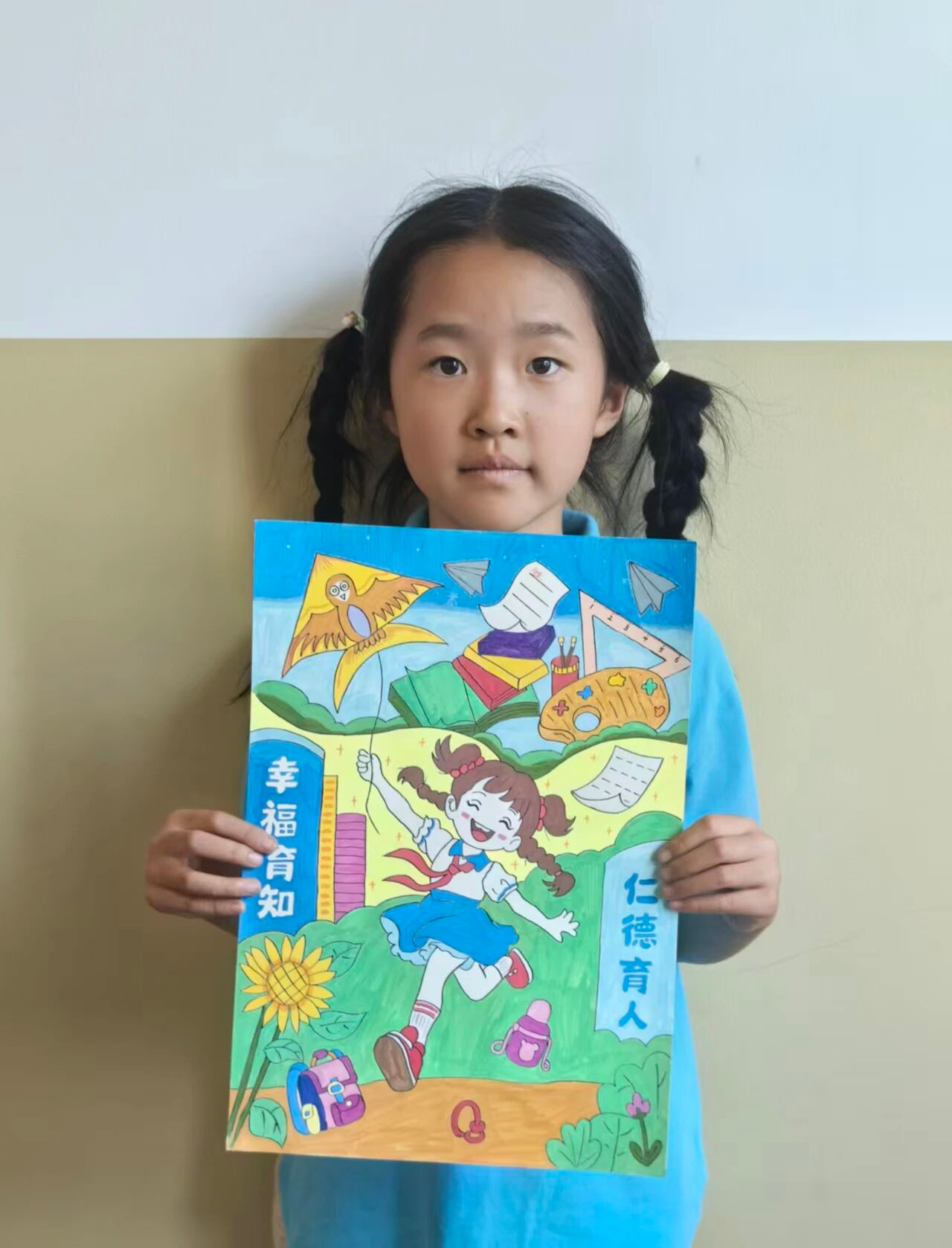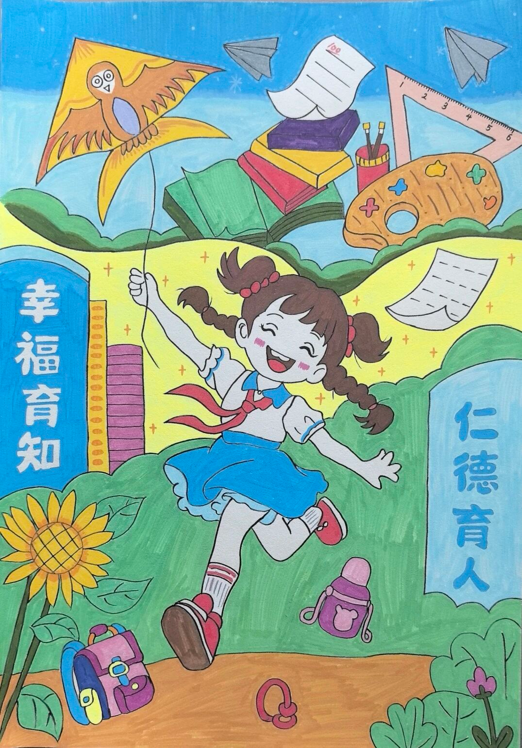 育知校区三(1)班 屈忆:这幅画展现了校园生活场景。画面中有“幸福育知”“仁德育人”的文字,还有女孩、风筝、书本、文具等元素,体现校园里学生们快乐成长、充满活力的氛围。