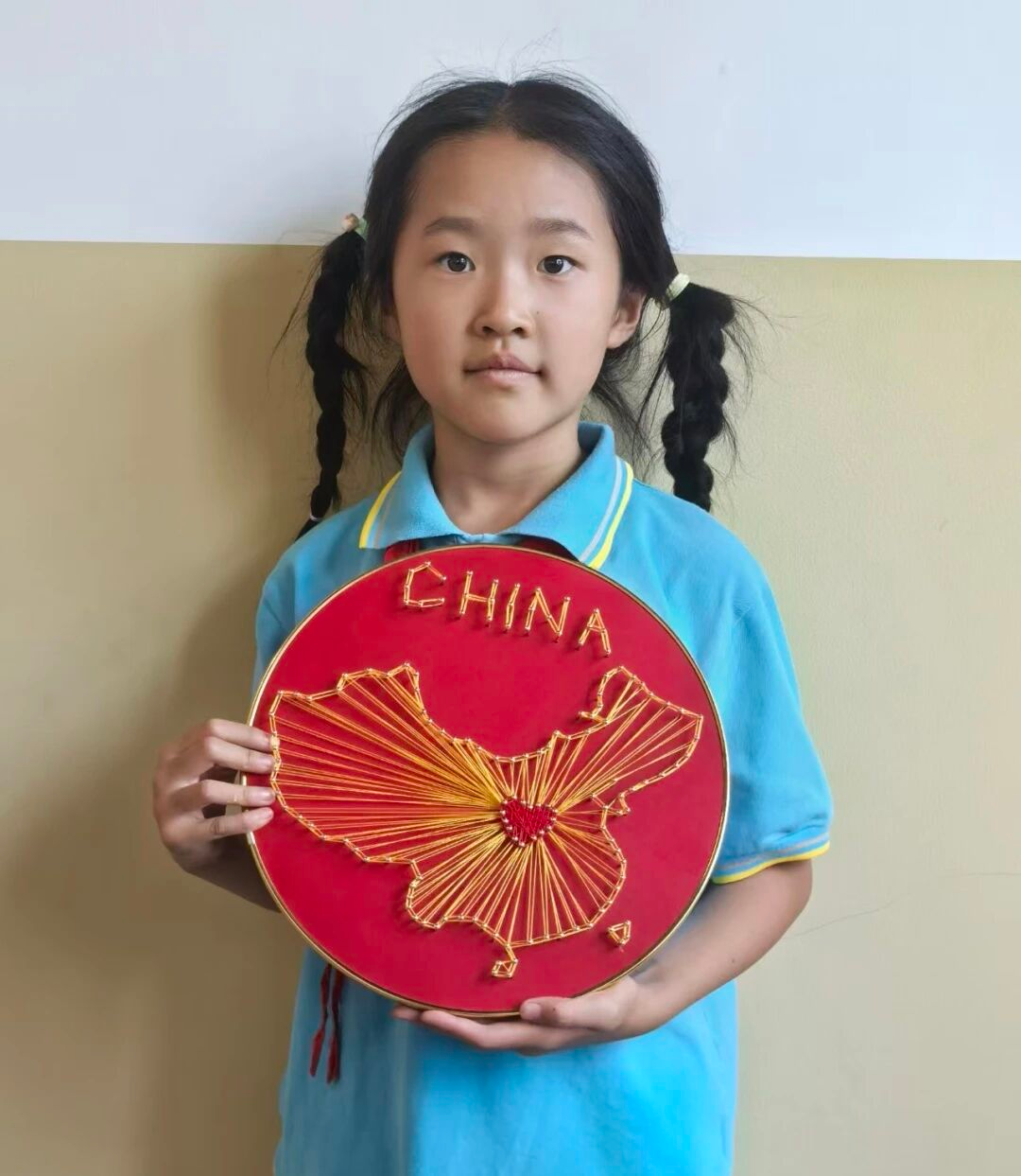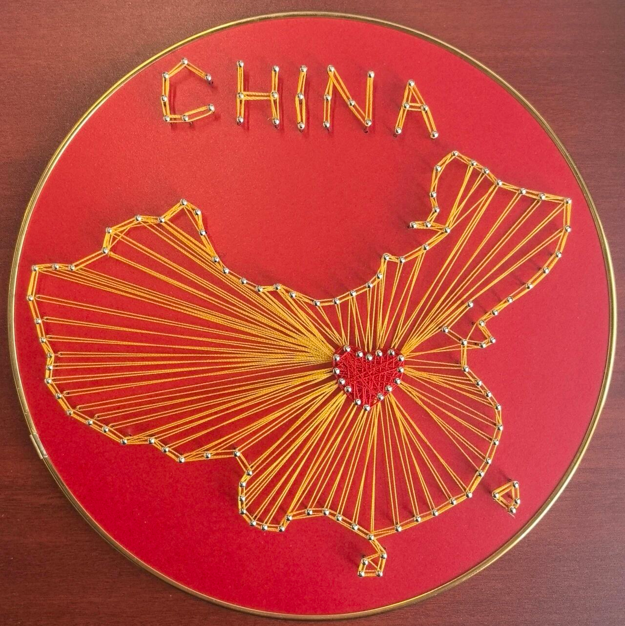育知校区三(1)班屈忆:这是一幅以中国为主题的弦丝画。画面用金色丝线勾勒出中国地图轮廓,中心有红色爱心,上方还有“CHINA”字样,整体以红色为底,充满对祖国的热爱与深情。