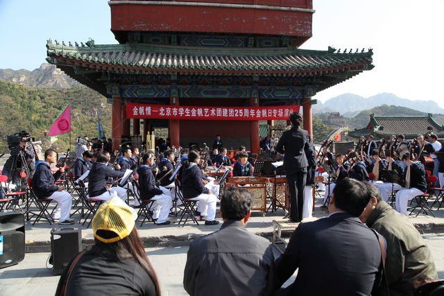为庆祝北京市学生金帆艺术团建团25周年的生日,2012年10月14日,由北京市金帆百人华乐团——北京昌平二中和北京三十五中的140名金帆民族乐团的团员在中华民族的象征——雄伟的长城居庸关上和人民解放军装甲六师,举行了“居庸关上金帆人,长城脚下中华情”、“金帆人、鱼水情、民族魂”两场民族管弦乐专场演出。此次活动是全市庆祝金帆团生日活动中的凝重一笔。音乐会演奏了《庆典序曲》、《霸王别姬》、《丝绸之路》、《月牙泉》、《飞天》、《长城随想曲一、二、三、四乐章)》等民族管弦乐力作,北京市教委体美处王东江处长,昌平区教委李成旺主任、林海波副主任、体美科王长军科长等领导亲临演出现场,对金帆百人华乐团的演出给予高度评价,获得现场众多国内外游客的热烈掌声。金帆百人华乐团的师生以此作为宝贵的礼物敬献给北京市金帆团,由衷地抒发着广大师生心中浓浓的金帆情。